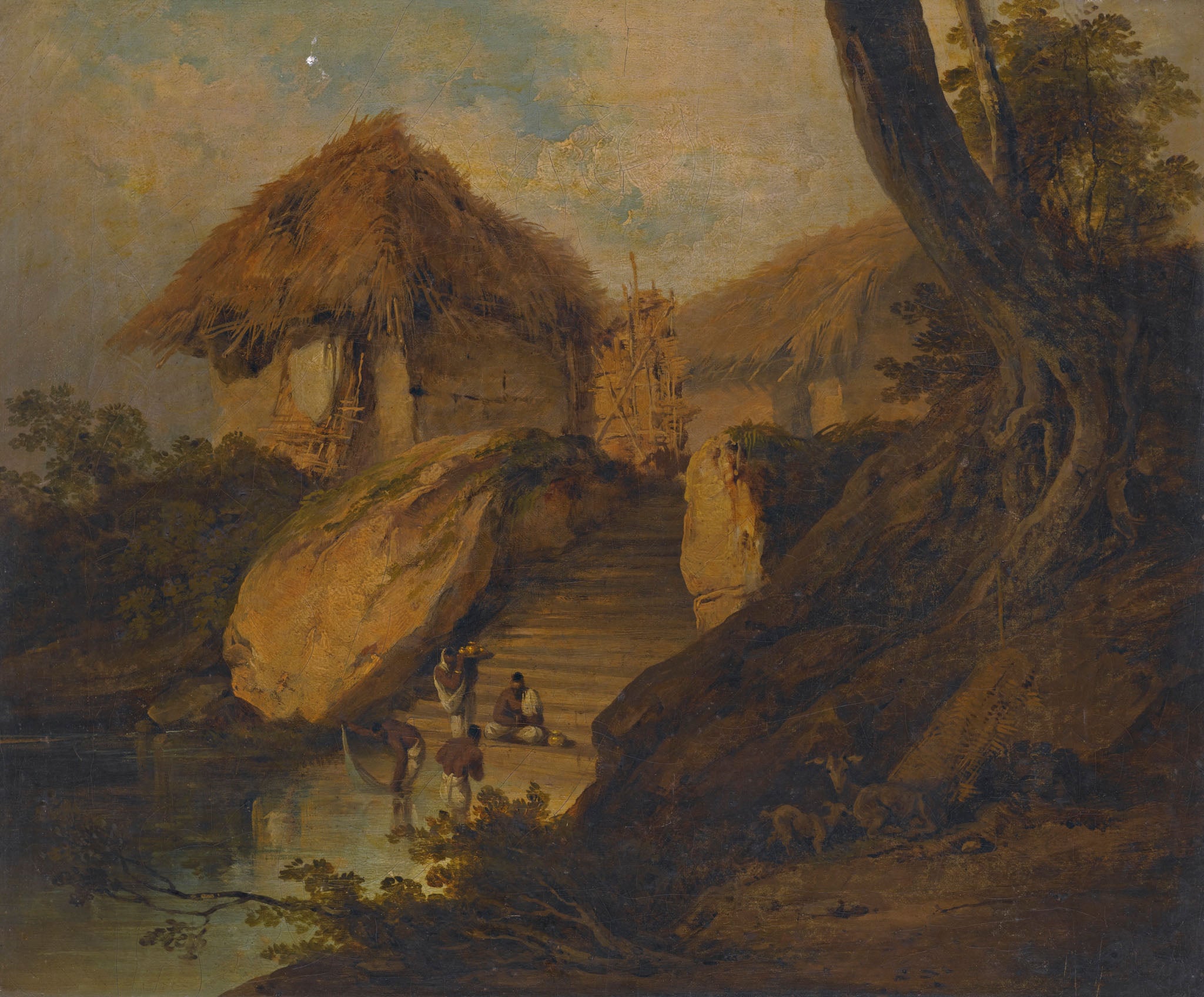 Figures Washing In A River With Thatched Huts Behind, Bengal, India